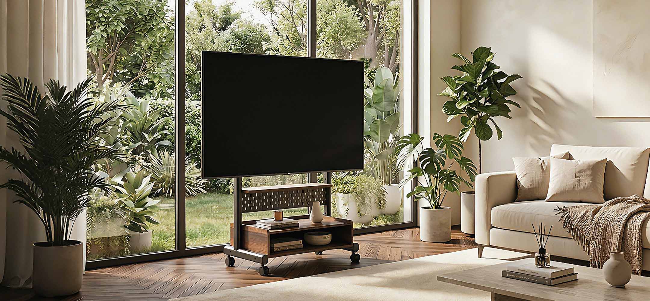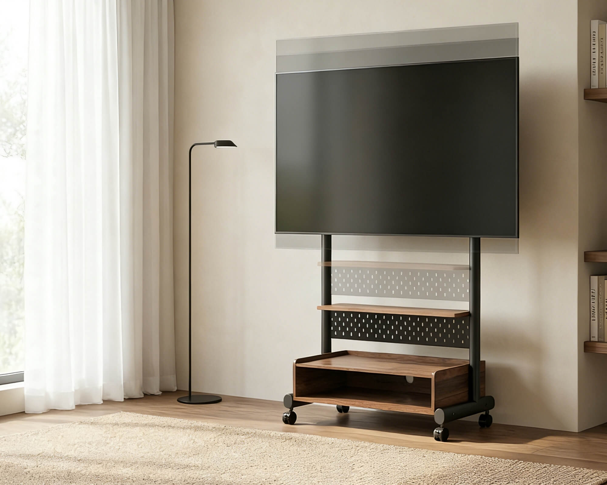 Rollbarer TV Standfuß am Fenster, flexibler Fernseher Ständer