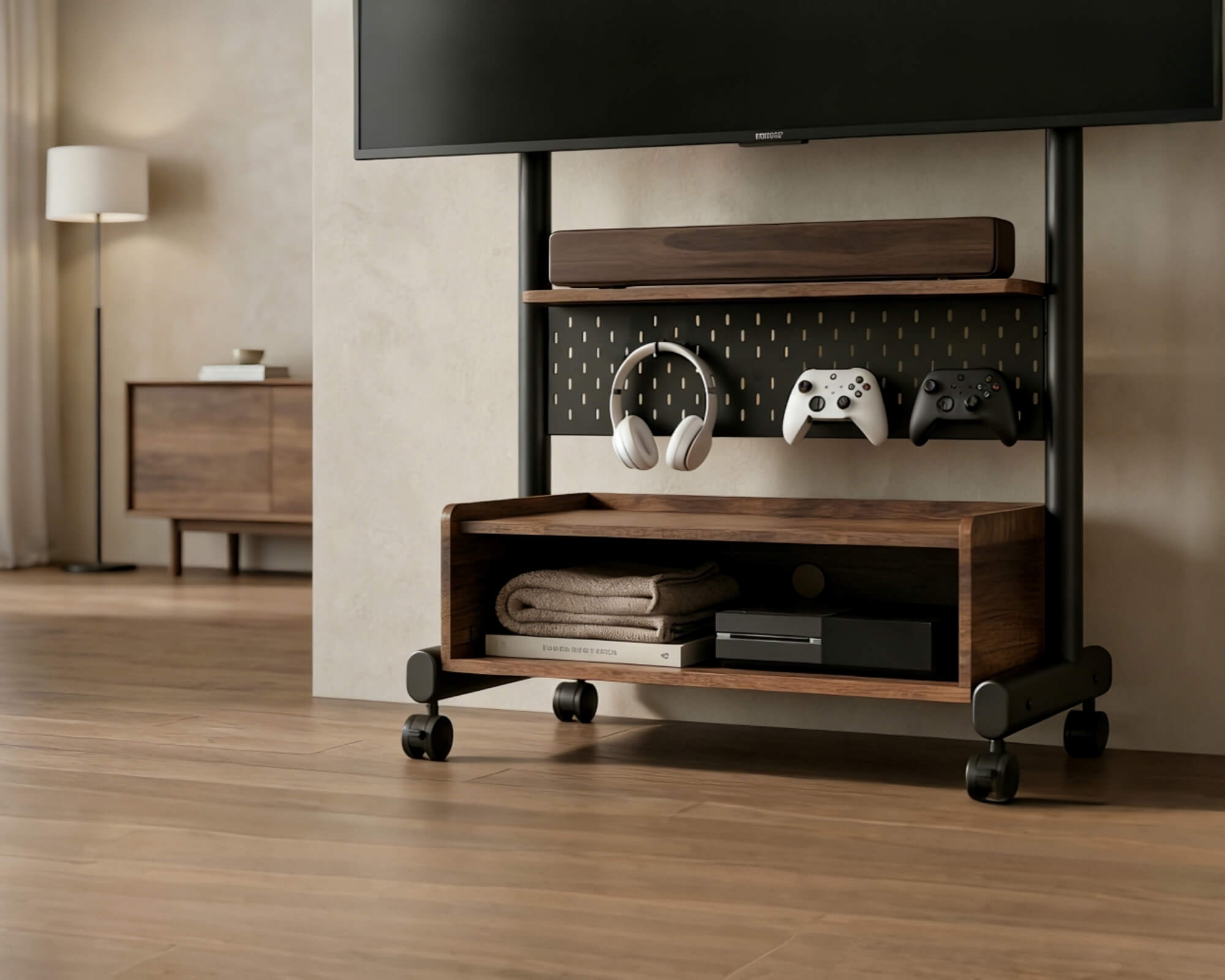 Pegboard für Gaming-Zubehör, eine Ablage für Ihre Soundbar sowie ein Fach für Konsolen und Receiver sorgen für Ordnung und Übersichtlichkeit in Ihrem Zimmer. Das integrierte Stauraumkonzept bietet praktische Lösungen für Zubehör wie Headsets oder Controller direkt am TV Wagen. So bleibt alles griffbereit verstaut und Ihr Setup wirkt stets aufgeräumt und strukturiert.